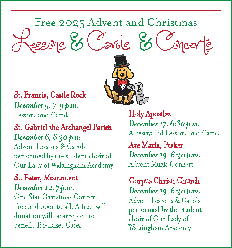 Dec. 24 — Vigil Masses, 4 p.m. in church, 4:05 p.m. (overflow Mass, in Julie Penrose Hall); 6:30 p.m.