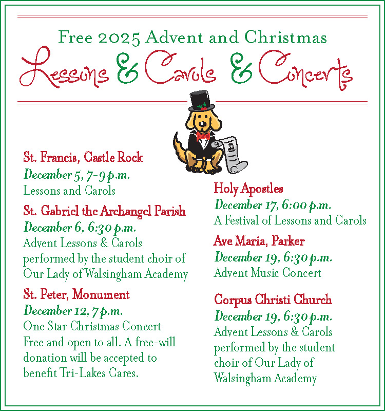 Dec. 7 — Diocesan Celebration of Our Lady of Guadalupe: 11:30 a.m.-12:15 p.m. Procession from Boulder Park (corner of N. Hancock Ave. and E. Boulder St.) to the Shrine; 12:30 p.m.-1:45 p.m. Bilingual Mass w/ Bishop James R. Golka; 1:45 p.m.-3:30 p.m. Social gathering in the gym.