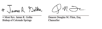 I, the Most Rev. James R. Golka, by the grace of God, Bishop of the Diocese of Colorado Springs, having consulted with the Presbyteral Council and the Pastors of both parishes, and keeping before my eyes the salvation of souls, and for the good of the faithful,