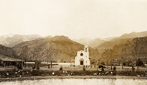 (PHOTO: Photo of Pauline Chapel from across the lake where the Broadmoor Hotel currently stands, circa 1918. Photos from the Diocese of Colorado Springs Archives.)
