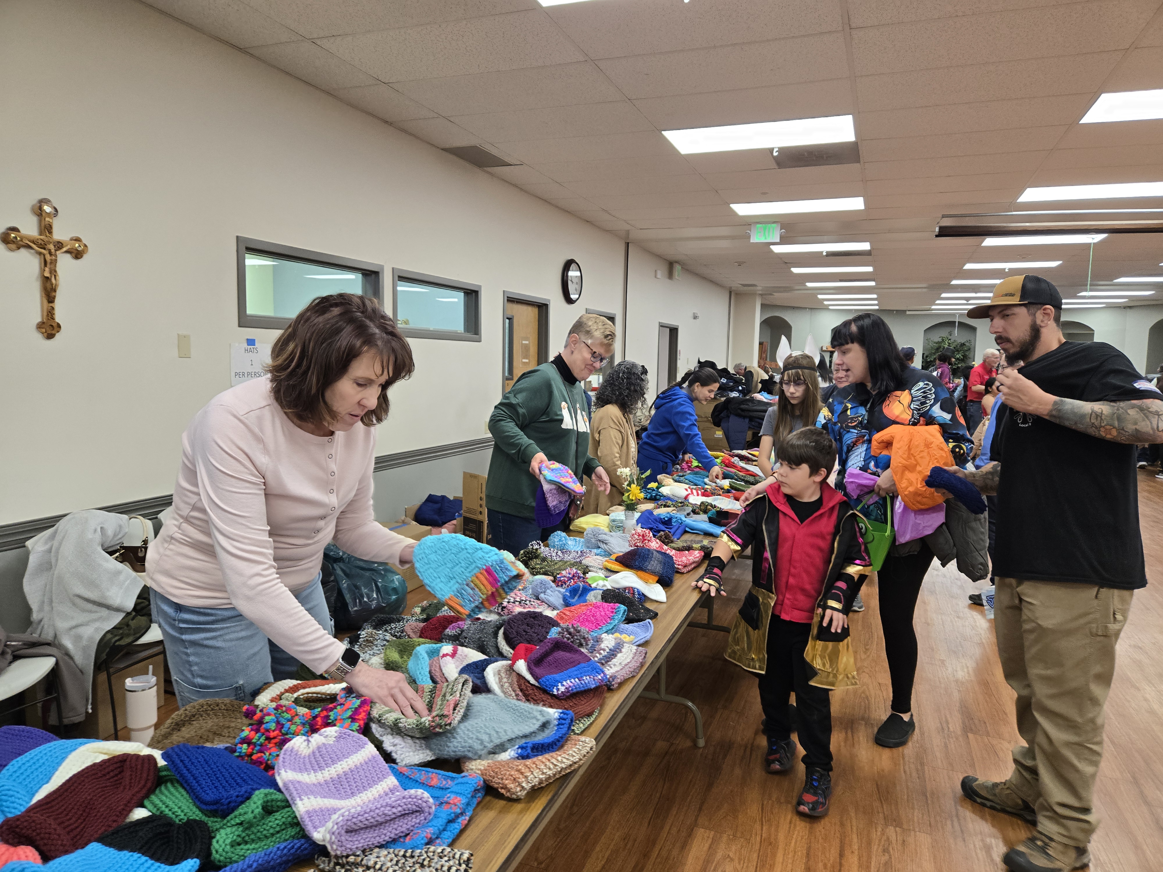 Adding to the excitement of the event were the 750 handmade beanies, stocking hats, and scarves made by members of the St. Joseph Prayer Shawl Ministry, crafters from Holy Trinity Parish, and several dedicated individuals. Their work added a deeply personal touch to the day. Lolita Hilbert, a leader in the St. Joseph Prayer Shawl Ministry, reflected on the group’s mission, saying, “We are all working for a common goal, which is to serve in fraternity and provide for the ones in need for the glory of our God.” Her words captured the heart behind every handmade item and the spirit that drives the ministry’s volunteers.