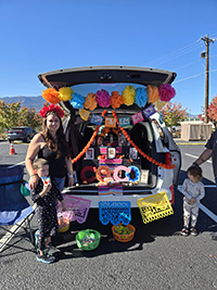 At the Colorado Springs distribution, families were welcomed into a festive Halloween-themed atmosphere. Catholic Charities volunteers hosted about 14 trunk or treat stations, filling the parking lot with laughter, costumes, and candy. Children moved from car to car with excitement, many already bundled in their new coats.