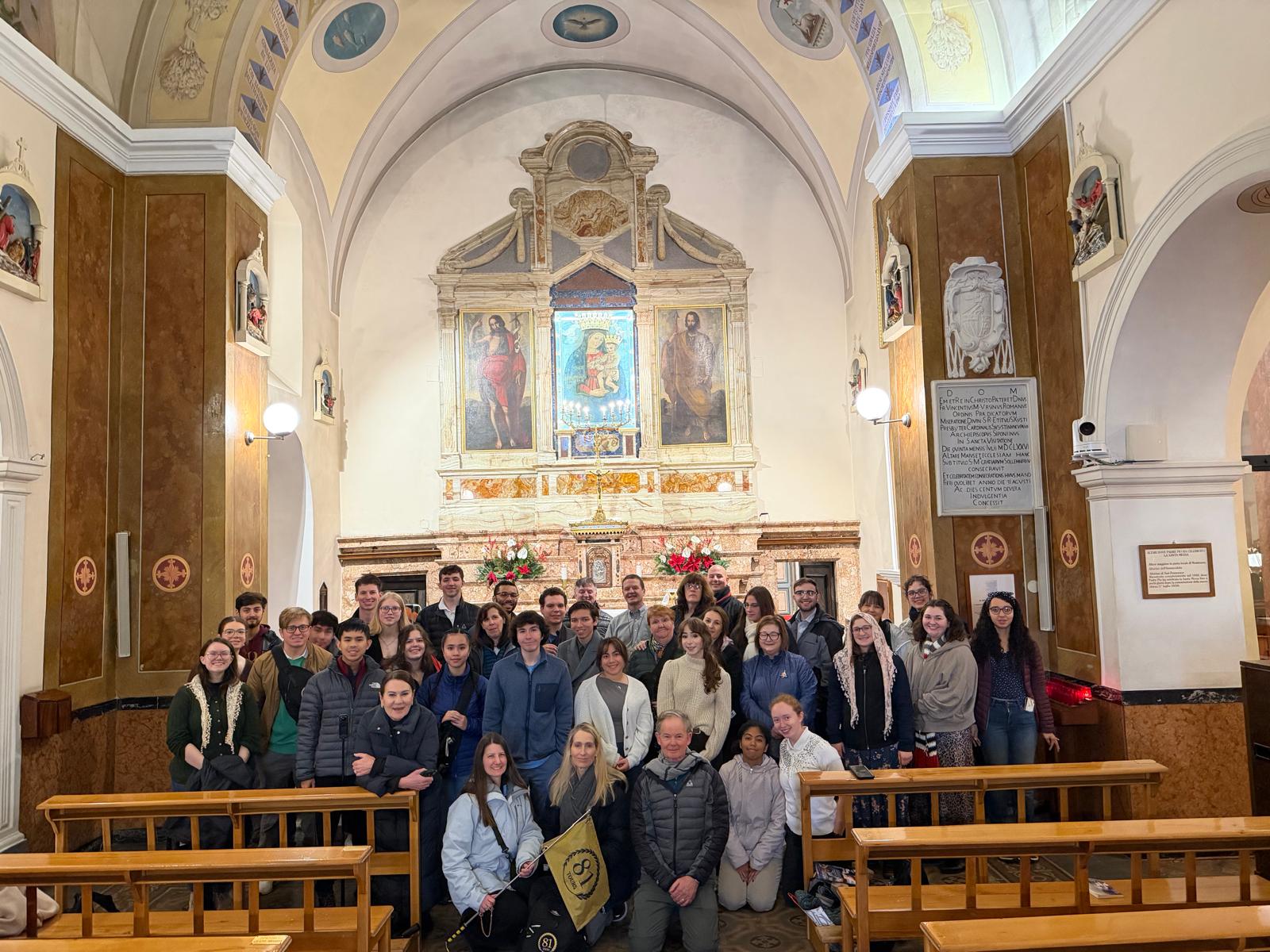 Father Jim Williams, Director of Campus Ministry, accompanied 23 young adults to Italy from Dec. 29, 2025 through Jan. 7, 2026. The pilgrimage included visiting holy sites in Rome, Assisi, Lanciano and San Giovanni Rotondo. For many of the young adults this was their first experience traveling to Europe, and they were drawn into the beauty and magnitude of the churches they were experiencing for the first time.
